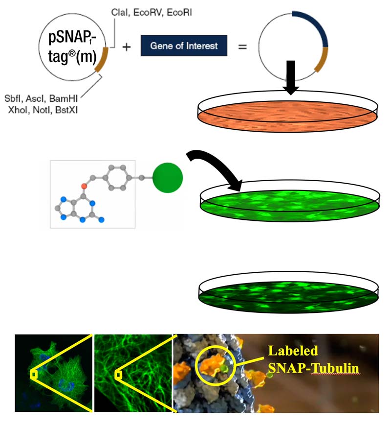 Klonieren Sie Ihr Zielprotein als SNAP-tag Fusion. Nach transienter oder stabiler Transfektion und und Expression des Fusionsproteins geben Sie das SNAP-tag Substrat Ihrer Wahl dazu (hier: Fluoreszenz-Konjugat), welches durch Diffusion in die Zelle gelangt. Nach Waschen des ungebundenen Substrats ist Ihr Zielprotein kovalent mit dem Fluorophor verknüpft und bereit zur weitere Experimente (hier Mikroskopie).