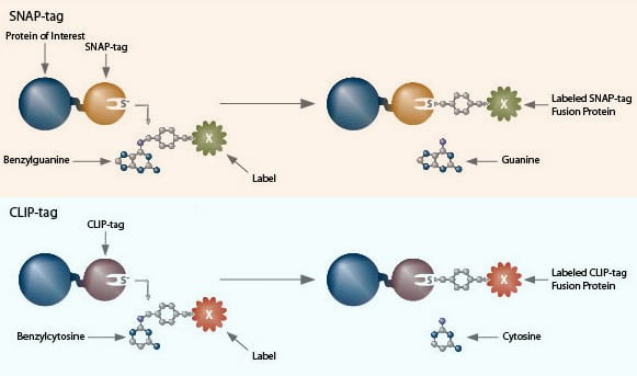 Sie exprimieren Ihr Zielprotein als Fusion mit dem SNAP-tag. Dieser bindet dann kovalent und hochspezifisch ein markiertes Benzylguanin-Substrat Ihrer Wahl.