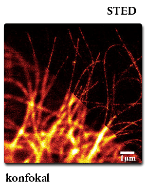 Konfokal bzw. STED- Mikroskopie an lebenden U2-OS Zellen: Zellen exprimieren das Mikrotubuli-bindende Cep41-SNAP-tag Fusionsprotein, nachgewiesen mit SNAP-Cell® 647SiR
