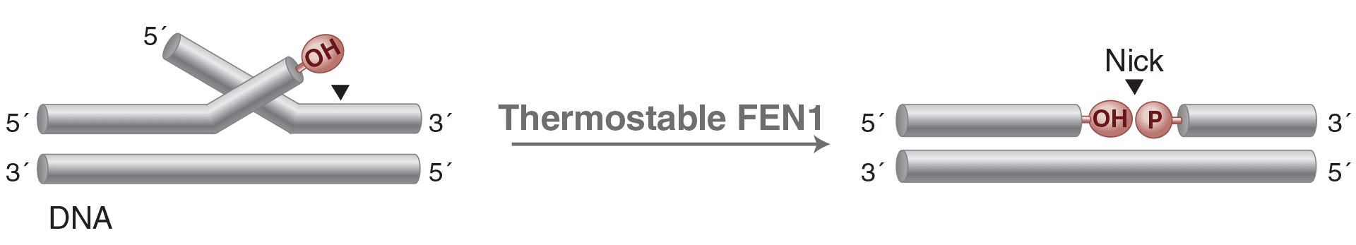 Thermostable Flap Endonuclease 1, FEN1, catalyzes the cleavage of 5´ DNA flaps from branched double stranded DNA substrates, creating a 5´ phosphate terminus. FEN1 products can be ligated by DNA ligase to create double-stranded DNA. In vivo, FEN1 is an essential component of the Okazaki fragment maturation pathway, and also plays a role in base excision repair.