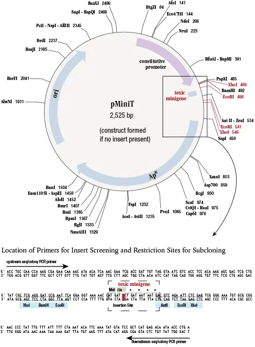 Map shown above displays the construct formed if no insert is present. Unique restriction sites are shown in black. Additional restriction sites that can be used for subcloning are shown in red. Expanded box below shows location of sequencing primers, restriction sites for subcloning, and placement of insertion site within the toxic minigene.