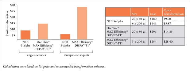 Take advantage of the low cost per transformation with NEB 5-alpha. Calculations were based on list price and recommended transformation volumes.