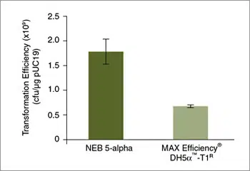 Benefit from the high transformation efficiencies of NEB 5-alpha: The transformation efficiencies of NEB 5-alpha and DH5α were compared using each manufacturer’s recommended protocols. Values shown are the average of triplicate experiments.