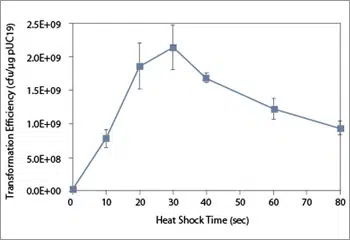 Effect of heat shock time on NEB 5-alpha competent E.coli transformation efficiency: 50 μl of competent cells were transformed with 100 pg of pUC19 control DNA following the provided High Efficiency Transformation Protocol except heat shock time varied from 0 to 80 seconds.