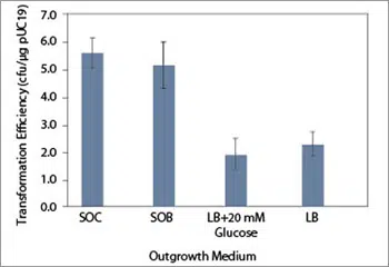 Effect of outgrowth medium on transformation efficiency: 50 μl of NEB 5-alpha competent E.coli was transformed with 100 pg of pUC19 control DNA following the provided High Efficiency Transformation Protocol with the exception of varying the outgrowth medium. NEB SOC outgrowth medium delivers the highest transformation efficiency.