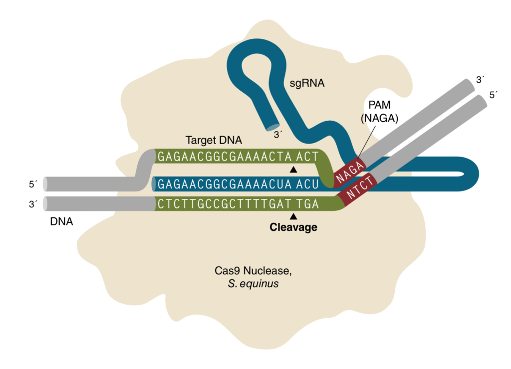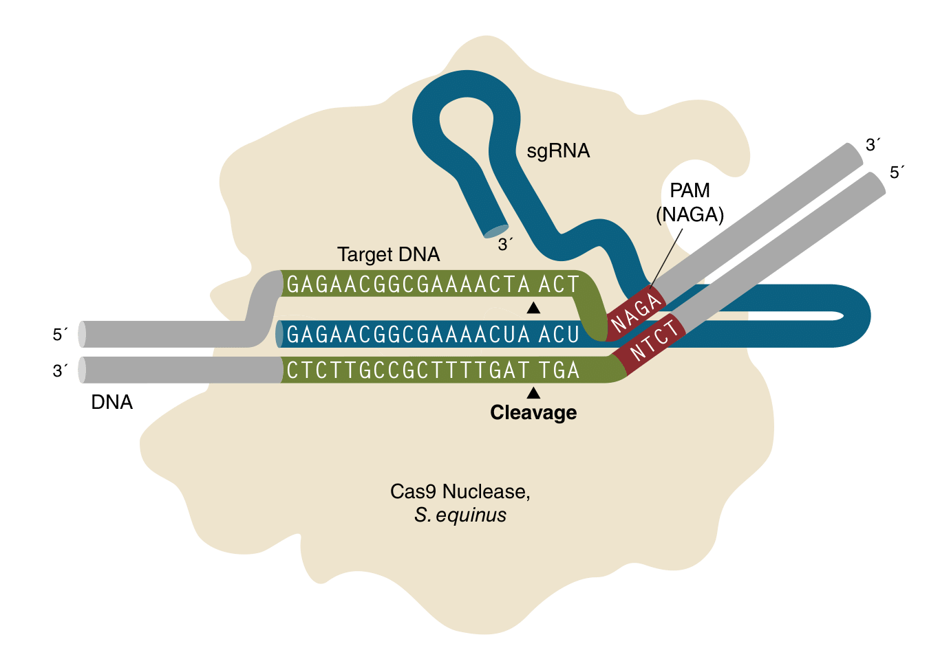 Abb. rechts: Schematic representation of Sau Cas9 nuclease sequence recognition and DNA cleavage