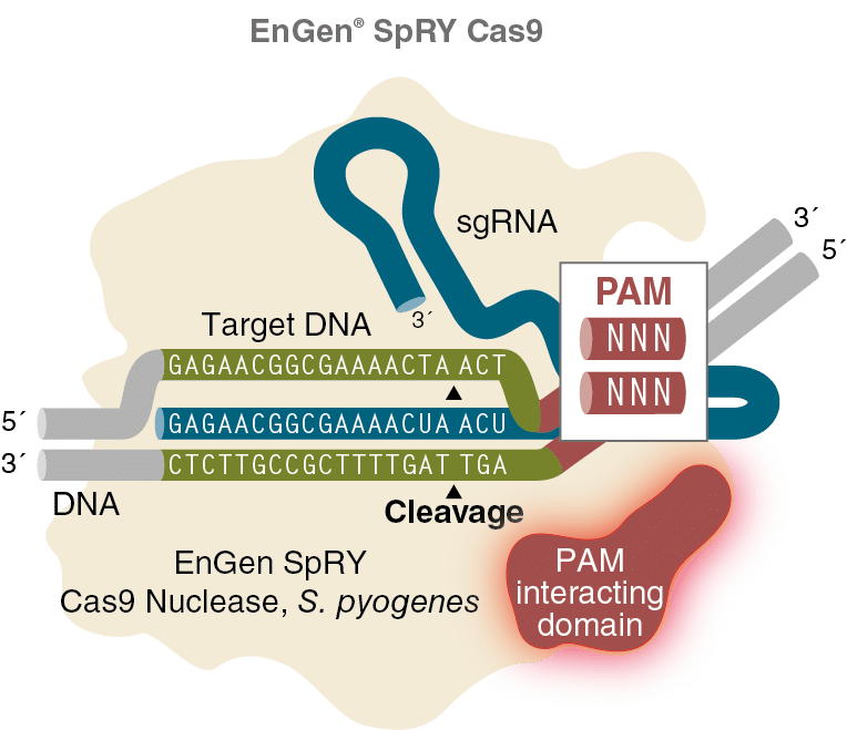 EnGen SpRY Cas9 is a variant of Cas9 nuclease from S. pyogenes with several point mutations within the PAM interacting domain. Unlike wildtype Cas9, EnGen SpRY Cas9 is not constrained by the presence of an NGG PAM and can produce a double stranded break three nucleotides upstream of any trinucleotide sequence in in vitro applications.