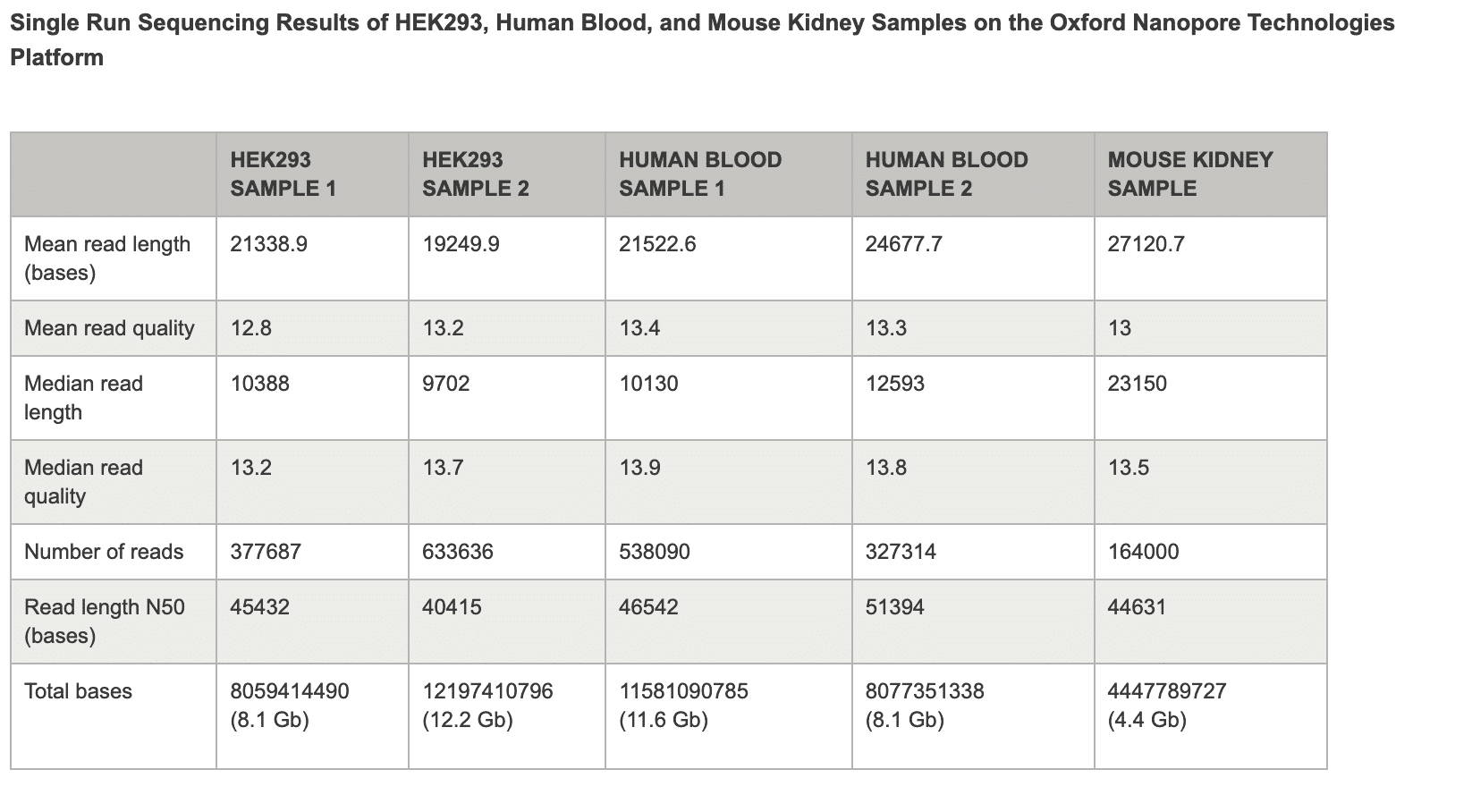 DNA used for the sequencing libraries was extracted by following the standard protocols for cultured cells and fresh mammalian blood samples, without further size selection. Mouse kidney DNA samples were extracted from fresh samples using a rotor-stator homogenizer for sample homogenization. Libraries were generated using the LSK109 ligation sequencing kit and loaded on a FLO-MIN106D flow cell. Sequencing was performed on a GridION® Mk1 for up to 48 hours, or shorter if no more data was generated by the flow cell. No additional treatment of the flow cell (e.g., flushing) was employed. In the samples that resulted in > 10 Gb of data, 800–1,000 ng of DNA library was loaded onto the flow cell for optimal sequencing performance and effective pore usage. Read lengths are indicated in bases unless otherwise noted.