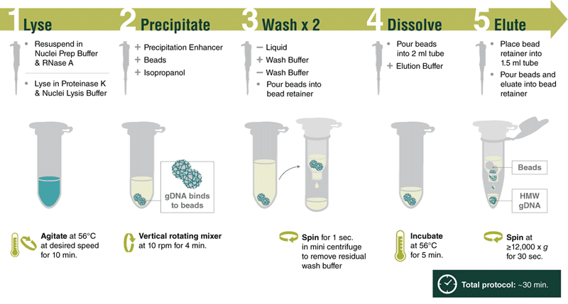 - Reproducibly purify high molecular weight genomic DNA (HMW DNA) from various sample types