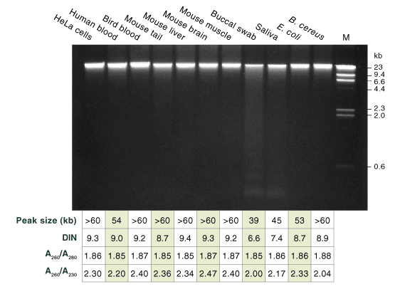 100 ng of genomic DNA from each sample was loaded on a 0.75% agarose gel. gDNA was isolated following the standard protocols for blood, cultured cells and tissue, and the supplemental protocols for buccal swabs, saliva, Gram– and Gram+ bacteria. Starting material used: 1 x 106 HeLa cells, 100 μl human blood, 10 μl bird blood, 10 mg frozen tissue powder, 1 buccal swab, 500 μl saliva and ~1 x 109 bacterial cells. Lambda DNA-Hind III digest (NEB #N3012) was used as a marker in the last lane (M). Purified gDNA samples were analyzed using a Genomic DNA ScreenTape® on an Agilent Technologies®4200 TapeStation®. Samples typically yield peak sizes 50–70 kb and DINs of ~9. The cell fractions processed in the buccal swab and saliva preps contain dead cells, as expected, causing a smear like pattern with typical low molecular weight apoptotic bands.