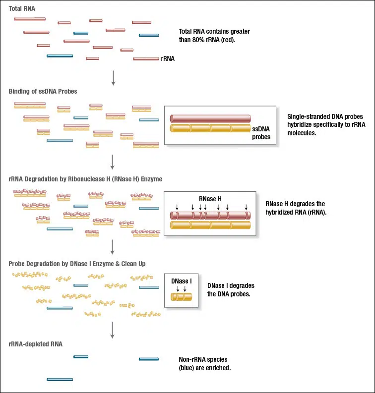 In typical RNA isolations the great majority of RNA comprises rRNA, while other RNAs like mRNAs are less abundant. Abundant RNAs can conceal the biological significance of less-abundant transcripts, making their efficient and specific removal desirable. NEBNext RNA Depletion kits facilitate the removal of abundant RNAs, while ensuring retention of RNAs of interest. These kits employ the efficient RNase H method: Single-stranded DNA probes hybridize specifically to rRNA molecules and subsequently RNase H degrades the hybridized RNA.