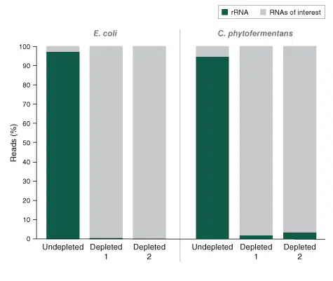 The NEBNext rRNA Depletion kit for bacteria is optimized for the depletion of ribosomal RNA from a range of different bacterial species, whether mono- or mixed cultures, gram-positive or gram-negative bacteria. Depletion of ribosomal RNA from 100 ng total RNA of Escherichia coli and Clostridum phtofermentans is shown as an example. The NEBNext Ultra II Directional RNA Library Prep Kit was used for subsequent library prep.