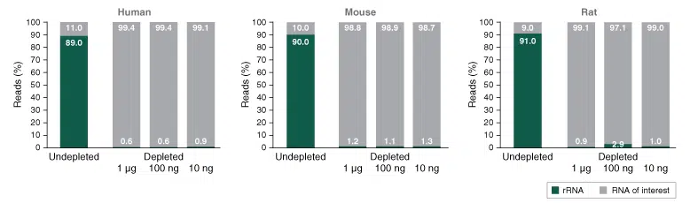 Efficient depletion of ribosomal RNAs from different input amounts (1 ug, 100 ng, 10 ng) of universal human, mouse and rat reference RNA. For subsequent library prep the NEBNext Ultra II Directional RNA Library Kit was used.