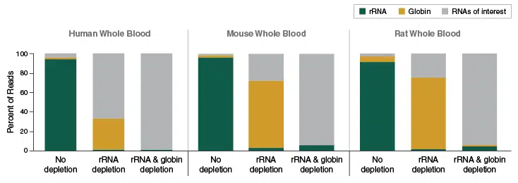 Depletion of globin mRNA and ribosomal RNA using the NEBNext Globin mRNA & rRNA Depletion Kit allows enrichment of desired RNA species from human, mouse and rat blood samples. For subsequent library prep the NEBNext Ultra II Directional RNA Library Kit was used.