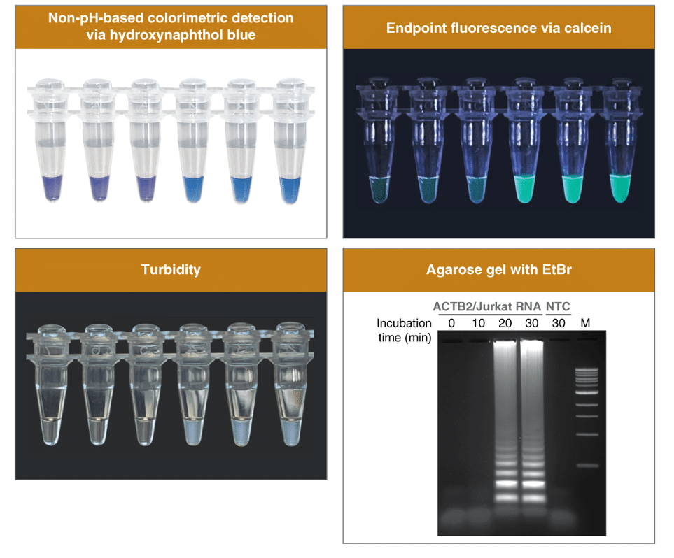 The WarmStart Multi-Purpose LAMP/RT-LAMP 2X Master Mix (with UDG) is compatible with different detection methods including color change, fluorescence, turbidity measurement or agarose gel.