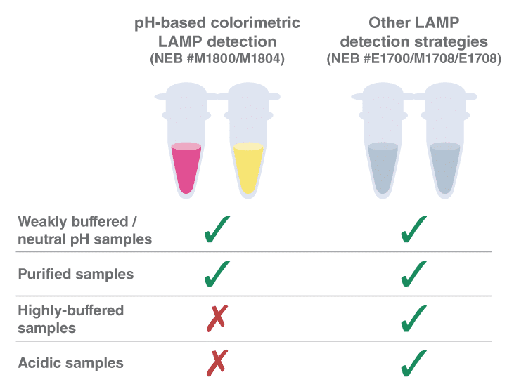 As a “universal” solution, we recommend using the WarmStart Multi-Purpose LAMP/RT-LAMP 2X Master Mix (with UDG). This Master Mix uses the WarmStart RTx and the Bst 2.0 WarmStart DNA Polymerase which are unbeatable in their performance. The Mix is compatible with many detection methods, including color change, fluorescence, turbidity measurement or agarose gel. The detection of the amplification is pH independent. Thus, this master mix can also be used for DNA or RNA samples in strongly buffered or acidic solution.