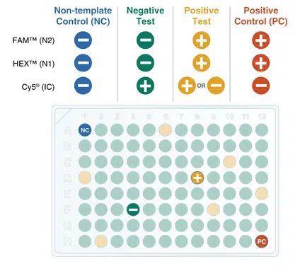 Using the Luna SARS-CoV-2 RT-qPCR Multiplex Assay Kit, up to 94 different samples can be assessed in a single 96-well plate. Anticipated results for each sample type are shown (in each fluorophore channel).