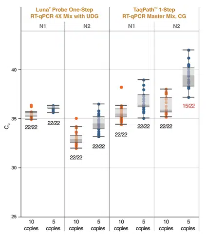 LOD comparison using: Luna SARS-CoV-2 RT-qPCR Multiplex Assay Kit for multiplex RT-qPCR targeting 2019-nCoV_N1 target (HEX) and 2019-nCoV_N2 target (FAM), according to reaction and cycling conditions provided in the E3019 product manual, and TaqPath 1-Step RT-qPCR Master Mix, CG for singleplex RT-qPCR targeting 2019-nCoV_ N1 (FAM) and 2019-nCoV_N2 (FAM), according to the CDC 2019-Novel Coronavirus (2019-nCoV) Real-Time RT-PCR Diagnostic Panel guidelines. Performance was evaluated using Synthetic Twist SARS-CoV-2 RNA Control 2 diluted in 10 ng of Jurkat total RNA. Data was collected on an Applied Biosystems® 7500 Fast real-time instrument (96-well, 20 µl reactions). Under these conditions, the Luna Kit has an LOD of 5 copies/reaction for both targets while the LOD using TaqPath is 10 copies/reaction for these targets.