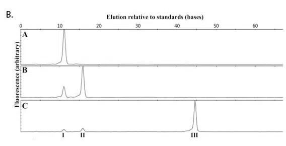 (B) Ligation of the RNA-splinted substrate in SplintR Ligase Reaction Buffer for 15 minutes at 25°C with (a) no enzyme, (b) 1 μM T4 DNA Ligase and (c) 100 nM SplintR Ligase. Indicated peaks correspond to starting pDNA (I), AppDNA (II) and ligated product (III) as determined by co-elution with synthetically prepared standards.