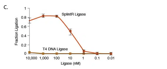 (C) The fraction of ligated product catalyzed by either SplintR Ligase or T4 DNA Ligase was analyzed by performing sets of ligations with both ligases at concentrations between 10 pM and 10 μM for 15 minutes at 25°C. SplintR Ligase is clearly much more efficient at ligation of RNA splinted DNA than T4 DNA Ligase.