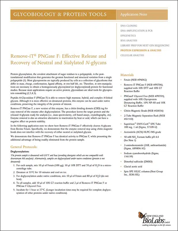 Für eine besonders einfache und umfassende Deglykosilierung Ihres Zielproteins empfehlen wir Ihnen den Protein Deglycosylation Mix II. Dieser Cocktail aus verschiedenen Enzymen entfernt in einem Schritt alle N-Glykane sowie einfache und einige komplexe O-Glykane.