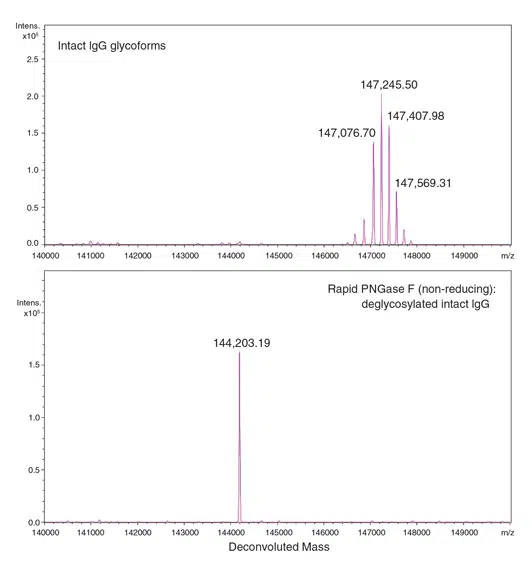 ESI-TOF Analyse eines Antikörpers vor und nach der Behandlung mit Rapid PNGase F (non-reducing format).