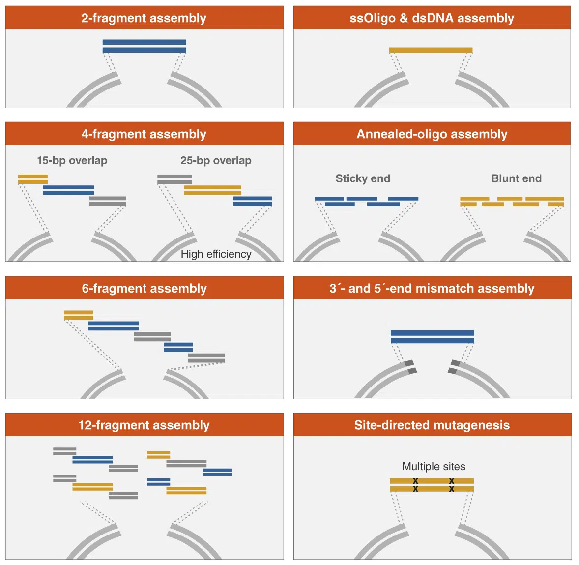NEBuilder HiFi DNA Assembly ermöglicht die Klonierung eines oder mehrerer DNA Fragmente an praktisch jeder Position des Vektors. Die Methode benötigt keine Restriktionsschnittstellen oder andere konstanten Sequenzen. NEBuilder HiFi DNA Assembly ist schneller als die herkömmliche Klonierung und es können mehr Fragmente in einer Reaktion verbunden werden.