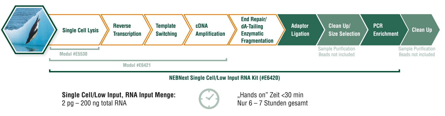 Diesen zentralen Workflow finden Sie auch in weiteren NEBNext Lösungen wieder: z.B. im Fragmentation System, in RNA-seq, Single Cell/Low Input RNA-seq, in den NEBNext EM-seq Kits für bisulfitfreie Epigenetikanalysen oder auch in den PCR-freien NEBNext Ultra II Lösungen. Oder Sie kombinieren ihn einfach mit den entsprechenden NEBNext Modulen.