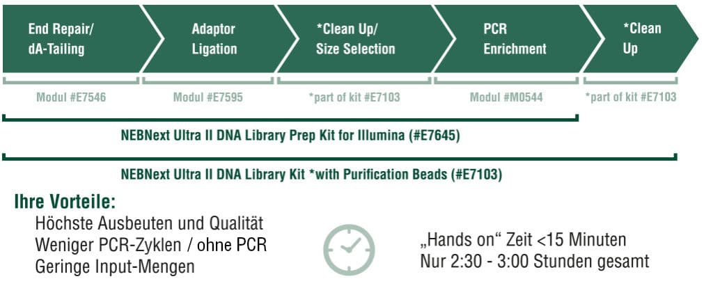 Denn ist ein Kit oder Workflow einmal etabliert, erlernen Sie die anderen NEBNext Ultra II Lösungen in kürzester Zeit und sparen sich Zeit und Geld für aufwendige und vollständige Neu-Etablierungen.