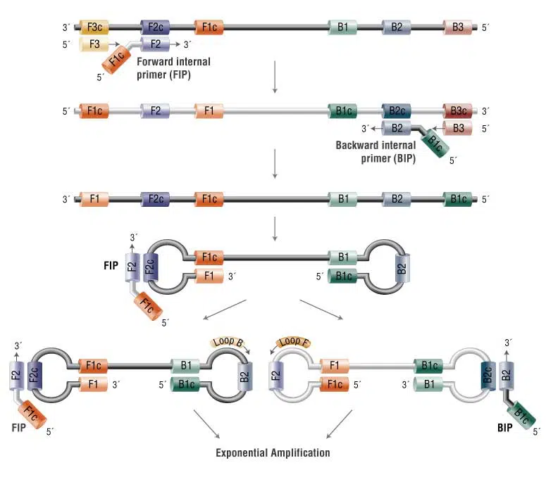 Die Loop-mediated isothermal amplification (LAMP, Schleifen-vermittelte isothermale DNA Amplifikation) verwendet vier bis sechs Primer, um ein bestimmtes DNA Fragment bei konstanter Temperatur zu amplifizieren. Hierfür benötigt man erstens eine DNA Polymerase mit starker Strangverdrängungsaktivität, zum Beispiel die Bst 3.0 DNA Polymerase. Zweitens werden ein Forward und ein Reverse Primer mit 5’ Überhängen versehen, die mit dem Amplicon hybridisieren und so zwei einzelsträngige DNA Schleifen (Loops) ausbilden. Diese dienen dann als Ausgangspunkte einer exponentiellen Amplifikation des gewünschten DNA Bereichs.