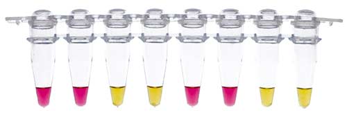Bei unseren colorimetrischen LAMP/RT-LAMP Kits ändert sich der pH-Wert der Reaktion durch den Einbau von dNTPs während der Amplifikation ins leicht saure Milieu. Daher kann die erfolgreiche Amplifikation mit einem besonders einfach zu detektieren sichtbaren Farbumschlag visualisiert werden.