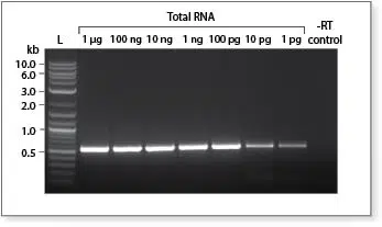 Die ProtoScript® II Reverse Transcriptase von NEB zeichnet sich außerdem durch eine exzellente Sensitivität aus. So ist z.B. eine Input-Menge von weniger als 1 pg Total RNA (oder 5 RNA Moleküle einer spezifischen mRNA) für eine erfolgreiche RT-PCR notwendig.