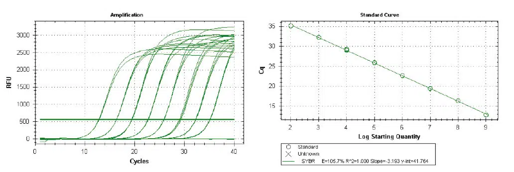 Abnehmende Mengen an Luciferase mRNA (109 bis 102) Moleküle wurden in Gegenwart von 1 ng Jurkat Total RNA in cDNA umgeschrieben (50 units ProtoScript® II Reverse Transcriptase ) 20 µl Gesamtvolumen. 1 µl des cDNA Produktes wurde mit dem qPCR Kit SsoAdvanced™ SYBR® Green Supermix analysiert. Der Nachweis von lediglich 5 Molekülen Luciferase mRNA belegt die exzellente Sensitivität der cDNA Synthese mit der NEB ProtoScript® II Reverse Transcriptase.