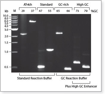 OneTaq Hot Start DNA Polymerase wurde im GC-Reaktionspuffer eingesetzt. Einige dieser Ansätze waren mit ihrem jeweiligen GC-Enhancer supplementiert.