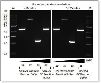 Amplifikation einer Auswahl an Sequenzen mit unterschiedlichem GC-Gehalt von gDNA aus humanen Zellen und C. elegans. Der Reaktionsansatz wurde bei Raumtemperatur pipettiert und (zu Demonstrationszwecken) anschliessend für 5 bzw. 50 min bei RT inkubiert. Die Performance der OneTaq Hot Start DNA Polymerase zeigt in beiden Fällen die erwarteten Banden ohne zusätzliche unspezifische Beiprodukte.