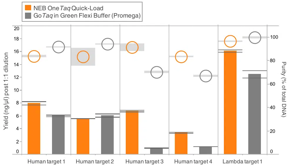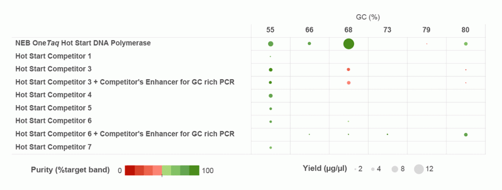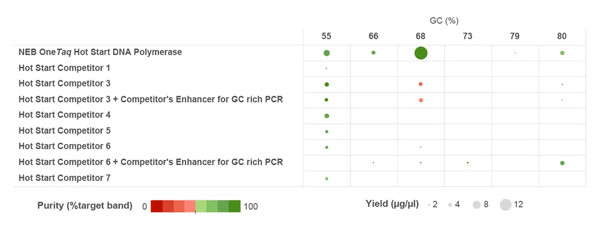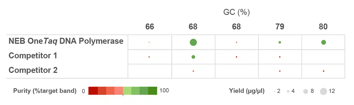 Die PCR-Amplifikation GC-reicher Regionen humaner gDNA verdeutlicht die Überlegenheit der OneTaq DNA Polymerase: Durch Mikrofluidik-Analyse wurden die Reinheit des Produktes und die Ausbeute der Reaktion ermittelt und grafisch dargestellt (Mittelwert aus drei unabhängigen Ansätzen). Die Farbe kodiert die Reinheit des Amplifikates (grün = reines Amplifikat, rot = unspezifische Nebenprodukte); die Größe der Kreise symbolisiert die Ausbeuten.