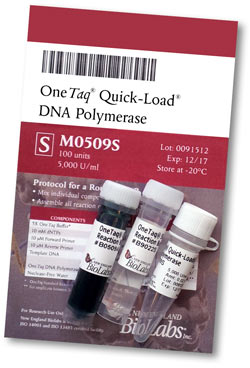 Ob GC-reich, AT-reich, kurz oder lang – OneTaq DNA Polymerase liefert hohe Ausbeuten und eine sensationelle Zuverlässigkeit ohne aufwendige Reaktions-Optimierungen. Der Trick der OneTaq ist so simpel wie genial: ein geschütztes Mischungsverhältnis aus Taq und DeepVent DNA Polymerase in einem optimierten Reaktionspuffer sowie einem optionalen GC-Enhancer erlaubt die bisher nicht gekannte Performance. Hierbei dient NEBs „high quality“ Taq DNA Polymerase als kraftvoller Motor. Die zusätzliche 3‘->5‘ Exonuklease-Aktivität der DeepVent Polymerase verbessert die Genauigkeit und sorgt für eine besondere Zuverlässigkeit der gesamten PCR-Reaktion. Und das Ganze zum sensationell günstigen Preis!