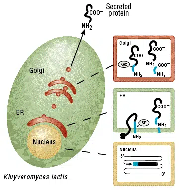 Nach Klonierung Ihres DNA-Fragmentes in den pKLAC1 Vektor und nachfolgender Expression erhält Ihr Protein die notwendigen Signalsequenzen und wird daher von der Hefe durch ER/ Golgi prozessiert und anschließend sekretiert.